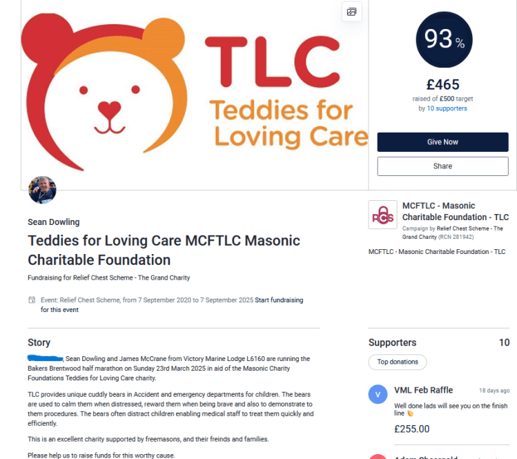 Teddies for Loving Care (TLC)-Masonic Charitable Foundation (MCF) https://www.justgiving.com/page/sean-dowling-3 Share this:Tweet Print (Opens in new window) Print Email a link to a friend (Opens in new window) Email Related