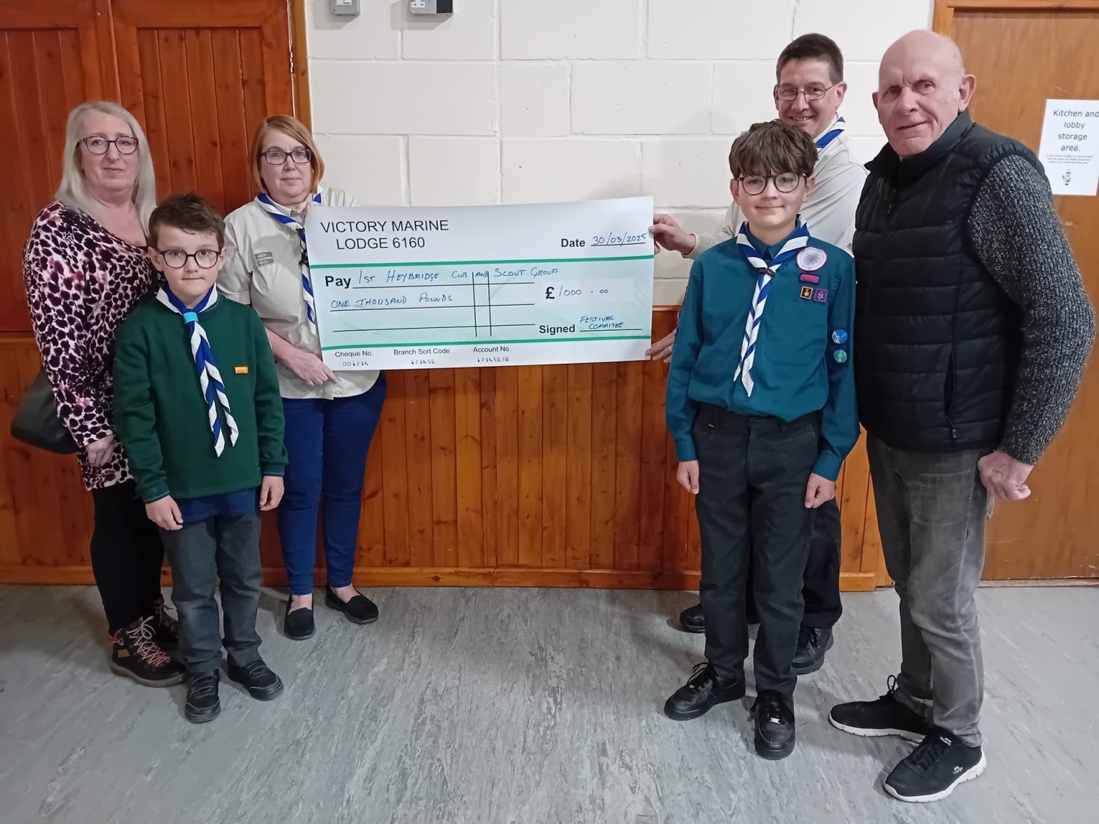 Victory Marine Lodge 6160 Past Master, W. Bro Jamie Knights & his wife Marion hand a cheque for £1,000 to the 1st Heybridge Cub & Scout Group raised from the Festival Committee. Share this:Tweet Print (Opens in new window) Print Email a link to a friend (Opens in new window) Email Related