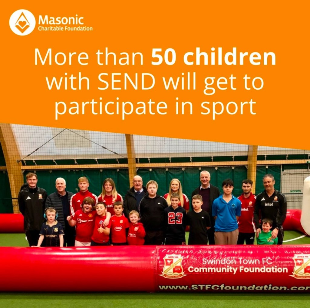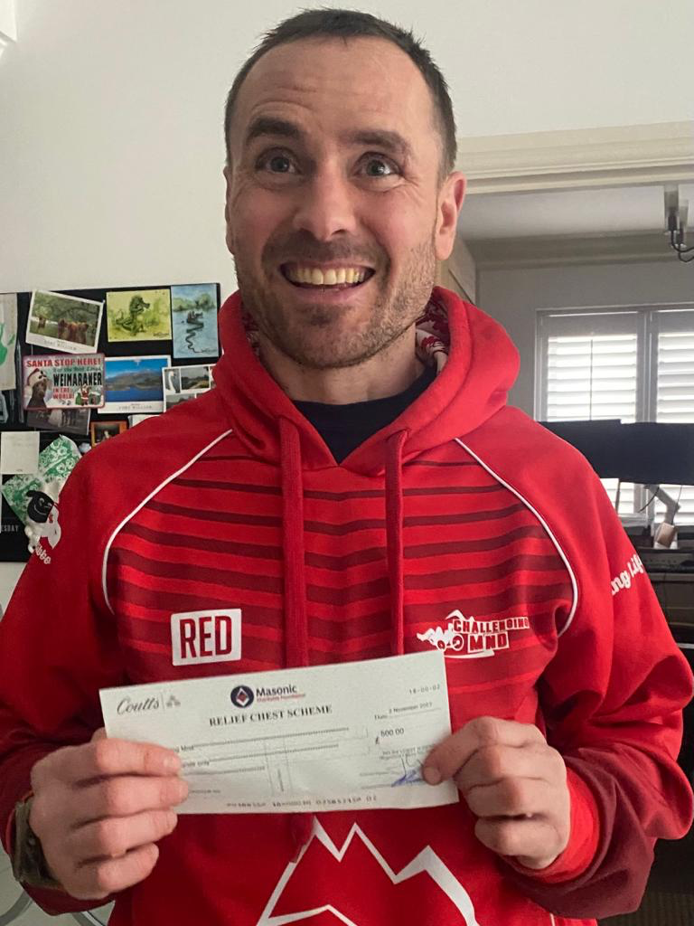Our Worshipful Master Jon Turner giving a donation of £500 to Alex Gibson who was diagnosed with Motor Neuron Disease 12 months ago & who has set up a charity “Challenging MND” for research into MND, a truly inspirational young local family man.